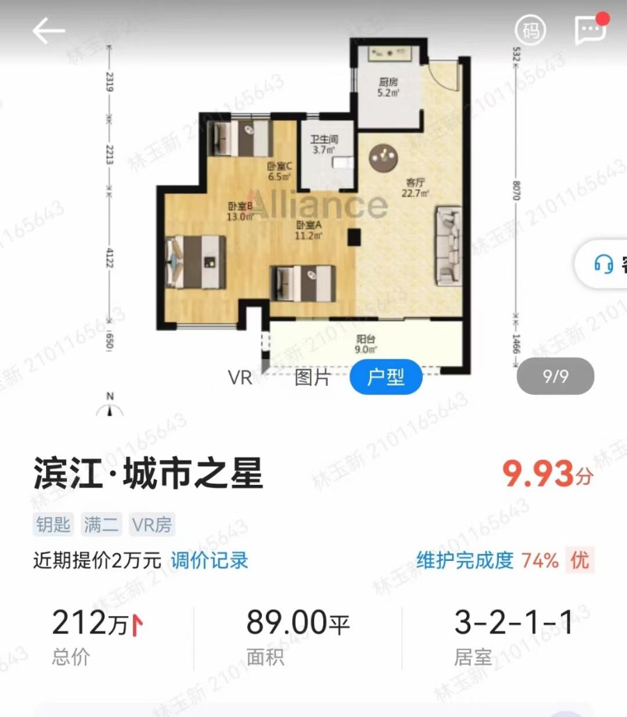 急售!滨江·城市之星好房!??楼层好,采光好。绿化覆盖率高,小区内配套好 ??89平米 212万 全新毛坯,三房,25楼,一共29楼
