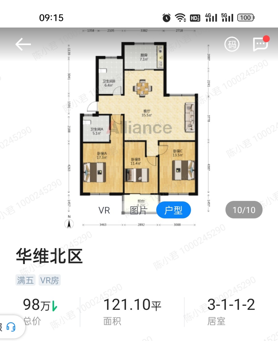 华维北区5/6楼,121方+大附房,精装修,98万,看房方便13575519607