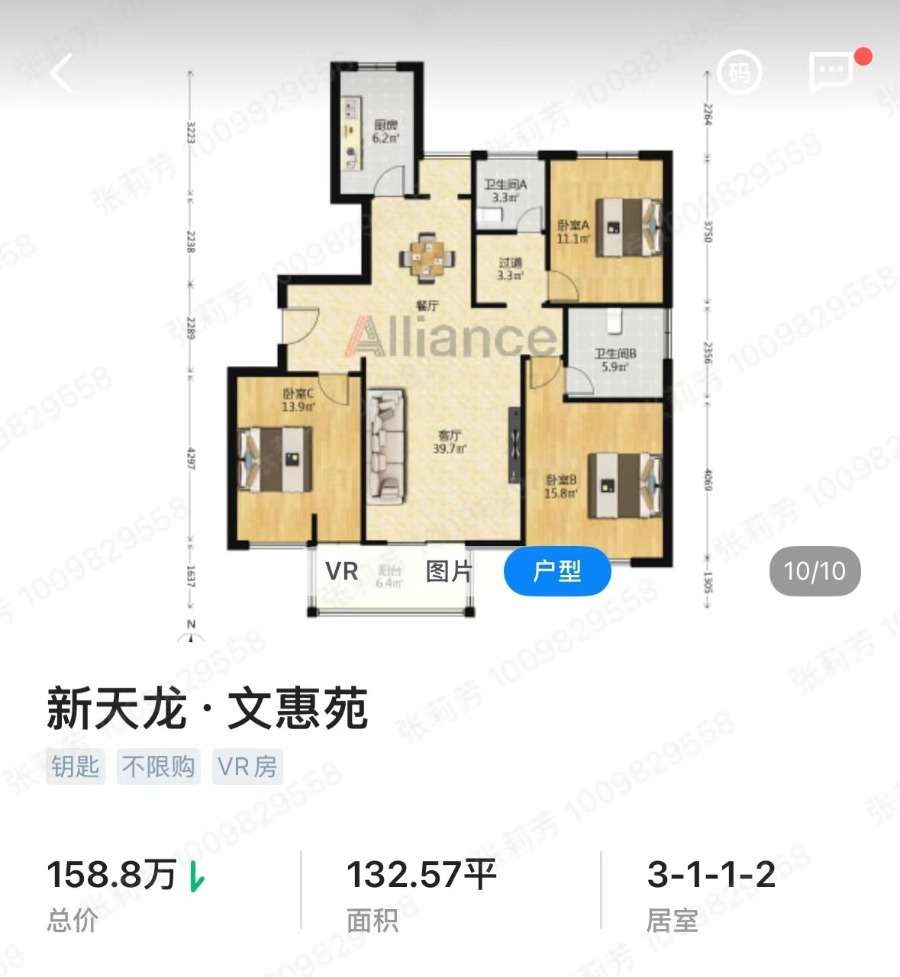 城西文惠苑黄金楼层,边套精装 132.57平,3室2厅2卫,158.8万