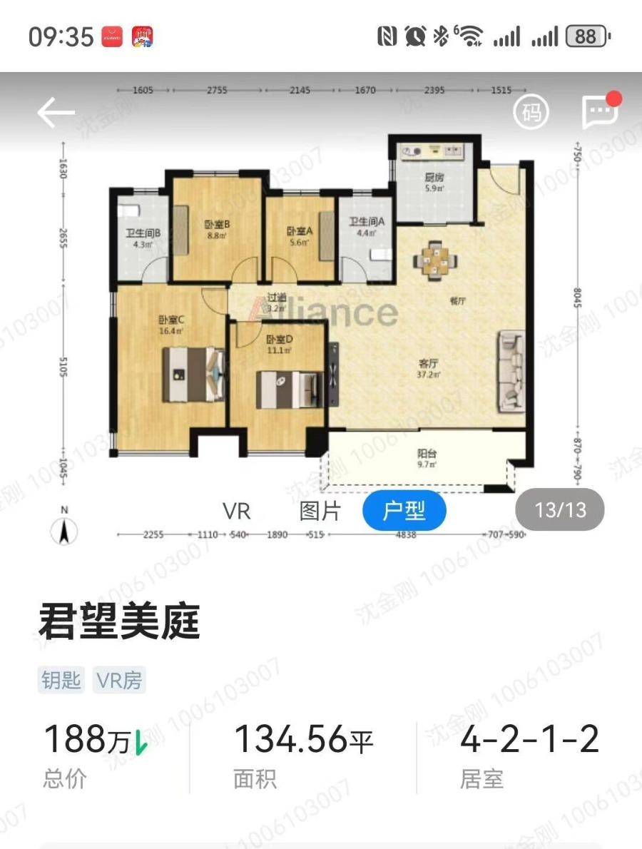 君望美庭 楼王位置 134平 一口价188带车位!明年6月满二过户 可协商提前交房装修!看房方便 黄金楼层